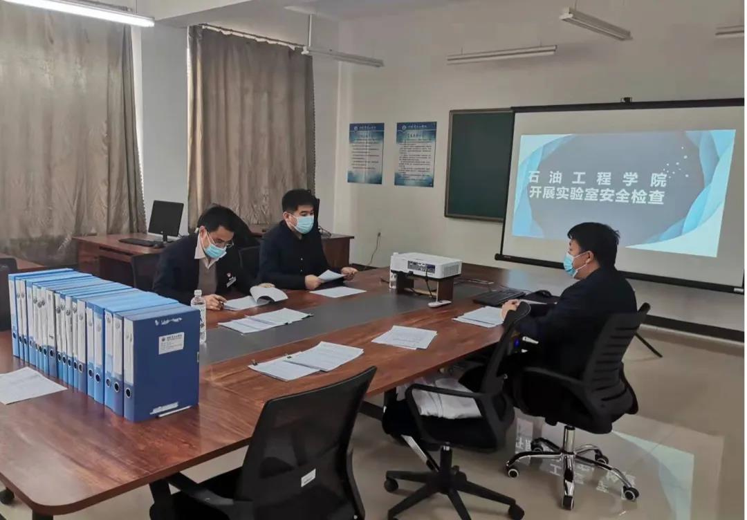 会议伊始,刘鑫主任对实验室的运行情况、安全制度、文件落实情况、学生的安全教育情况、自查自检情况、水电消防、安全隐患等情况进行了详细汇报。随后,对岩石力学实验室、钻井工程实验室、渗流力学实验室等实验室以及库房进行一一检查。对实验室电源主控台和电闸、消防器材、实验室用水、实验器材及各项配套设施情况进行了细致全面的排查。
