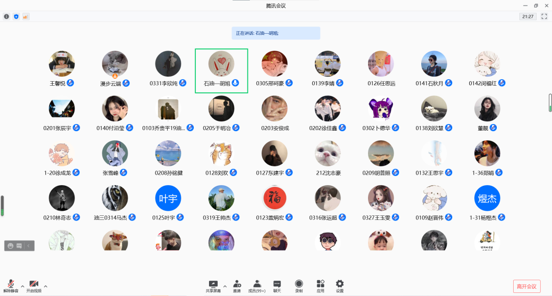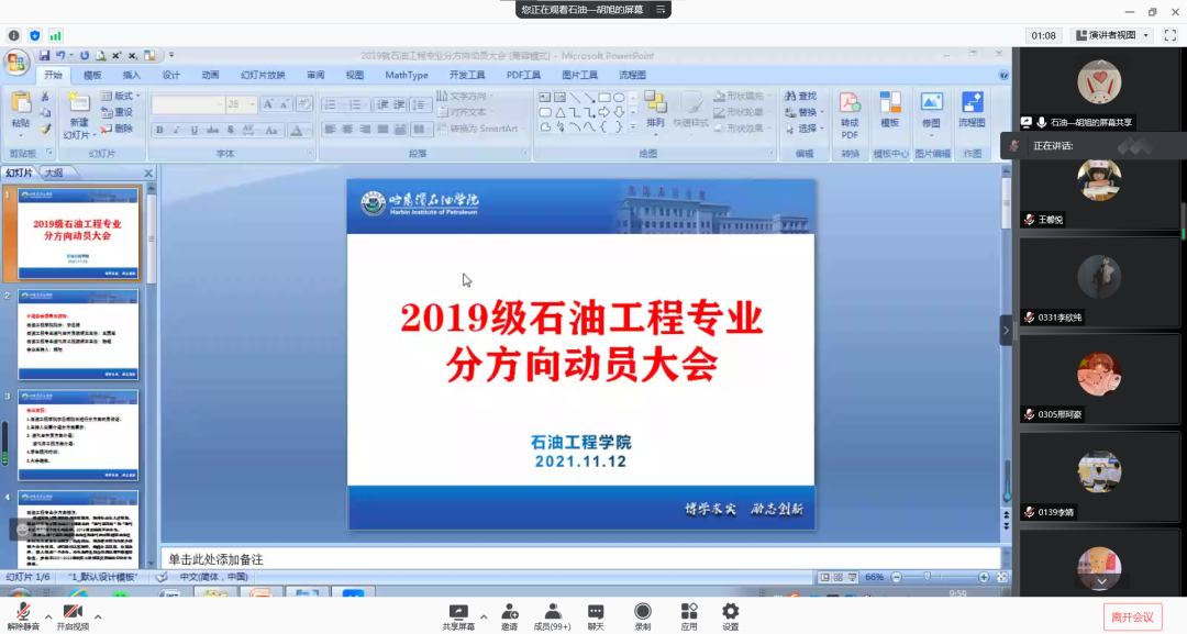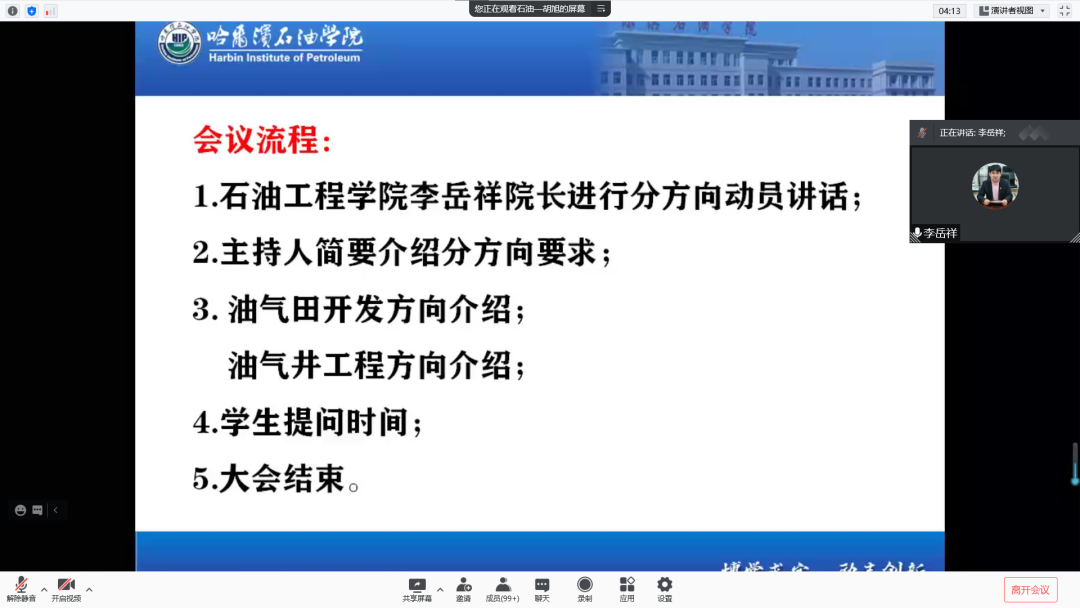 为确保2019级石油工程专业分方向工作顺利进行,让同学们更深入了解专业特点,我院于11月12日上午10:00在腾讯会议召开2019级石油工程专业分方向动员大会。院长李岳祥、油气田开发教研室主任王国库、油气井工程教研室主任杨昭及2019级石油工程系全体学生出席本次会议,会议由石油工程系主任胡旭主持。