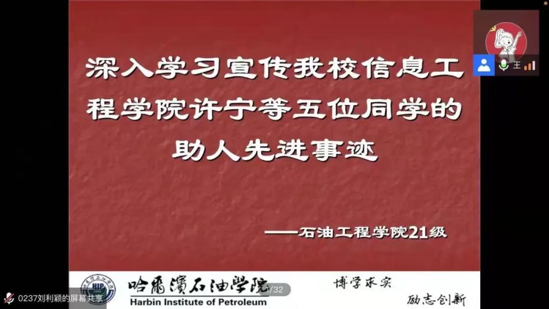 为了增强同学们助人为乐的意识,形成一种积极的自我意识,我院于11月6日晚18时30分于腾讯会议举办“深入学习宣传伟德官网信息工程学院许宁等五位同学的助人先进事迹”。石油工程学院21级全体同学参加此次会议。会议由2021级辅导员助理王娜老师主持。