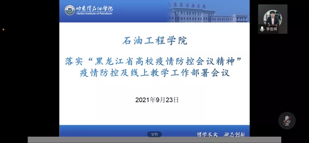 当前防控形势复杂严峻,为保证师生在安全情况下,顺利完成教学进度,石油工程学院于9月23日晚7点30分在腾讯会议召开落实“黑龙江省高校疫情防控会议精神”疫情防控及线上教学工作部署会议。石油工程学院全体教师参会议,会议由石油工程学院李岳祥院长主持。