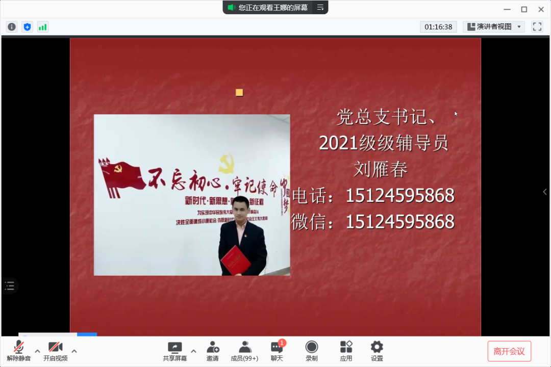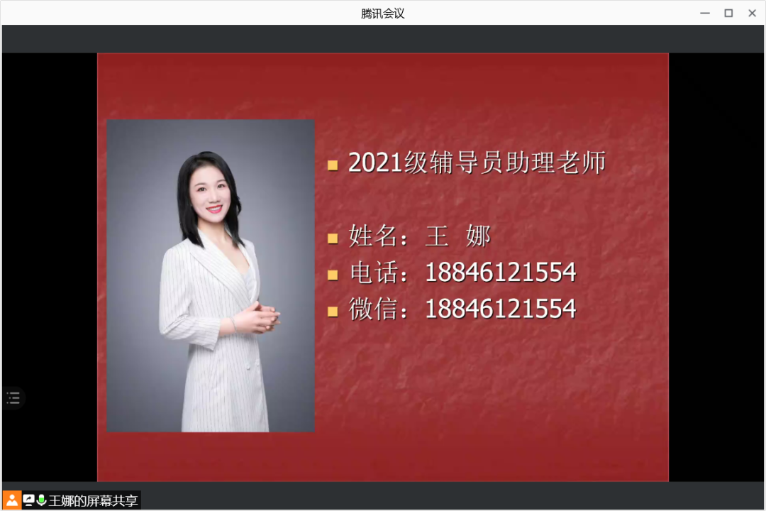 会上新生辅导员助理王娜老师向家长们介绍了2021级新生的基本情况、报到流程、报到时间和报到方式,对学校准封闭管理的政策和要求做了全面介绍,并提醒新生及家长提高防范意识,谨防网络诈骗。