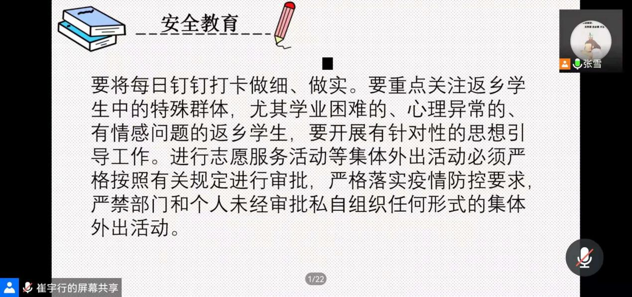 为了进一步加强疫情防控,强化学校安全工作及暑假期间安全管理,学院按照省教育厅和学校的有关要求,认真组织落实,层层推进,要求各年级进行主题教育班会,又重点对2018级“3+1”综合实习的安全工作重点进行了部署,我院于7月29日召开线上主题教育班会,20级,19级,18级全体分别参加腾讯线上会议,会议由各年级辅导员主持会议。