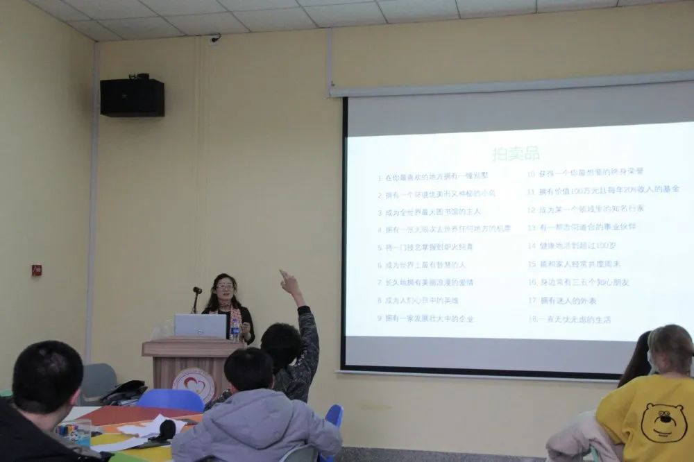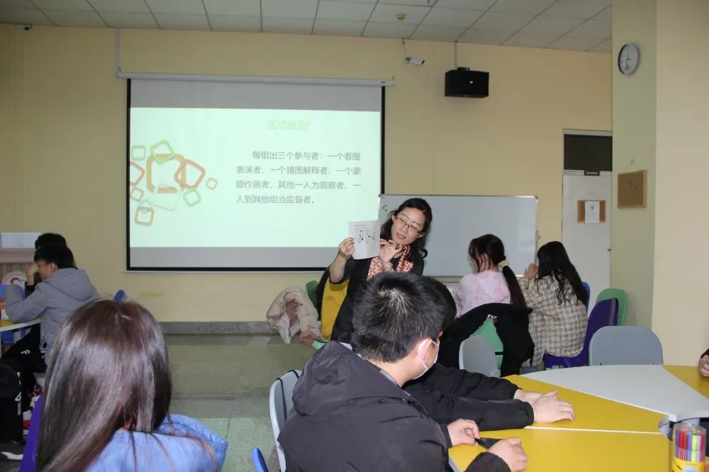 首先,在活动过程中王威老师带领同学们进行团体凝聚力训练活动,以寝室为单位绘画出各自想法,绘制完毕后进行讲解。同学们交流思想,增加信任,改正不足。进行“你画我猜”活动,使同学们在看不见的情况下传递信息,明白误会产生于不理解,通过游戏引导同学们在日常生活中以正面视角看待问题,传播正能量。随后又进行了“拍卖会游戏”,进一步让同学们去了解自己的世界观,认识自我,改善自我。
