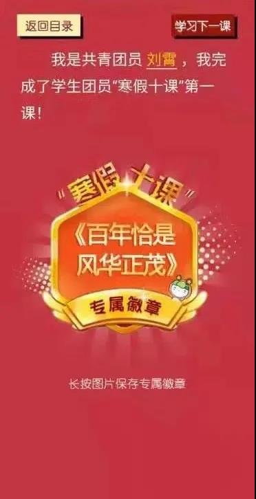 寒假十课分为理想、祖国、榜样、青春、未来五部分内容,并结合党的十九届五中全会精神,强调青年人处在祖国飞速发展的大好时期,应努力学习各项知识,为祖国发展努力奋斗。我院青年团员线上学习后,完成答题并集齐了徽章。此次活动,不仅丰富了我院青年团员的假期生活,也让各位团员同学认识到了基层团组织和青年团员的重要性。我院将继续以党团精神为指引,教育广大团员青年,发挥团员青年的重要作用,做好团组织的各项工作!