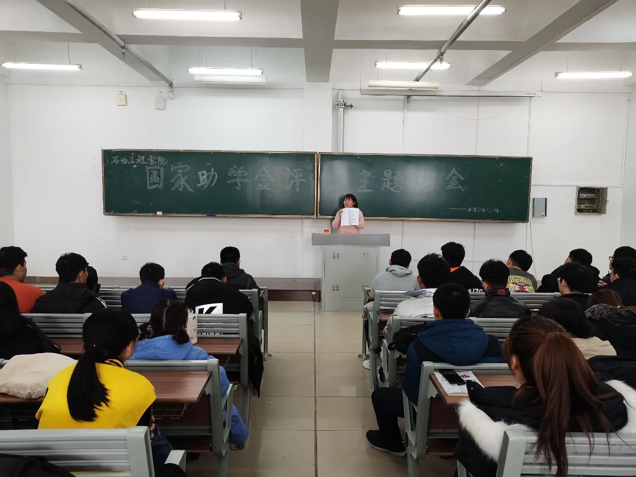 会上,各年级辅导员向各班同学宣读了有关评选国家助学金的文件并传达了相关文件精神,提出此次国家助学金的评比方法及要求。辅导员老师们指出,此次评选关系到大家切身利益,一定要秉承公开、公平、公正的原则,班级同学通过平时对本班各位申请助学金资助的同学的了解,以投票的方式,对本次评定助学金的同学表以赞同或否认的看法,根据学院的相关要求,认真评定出本班申请助学金的学生名单及档次,当场唱票结果,并进行公示。