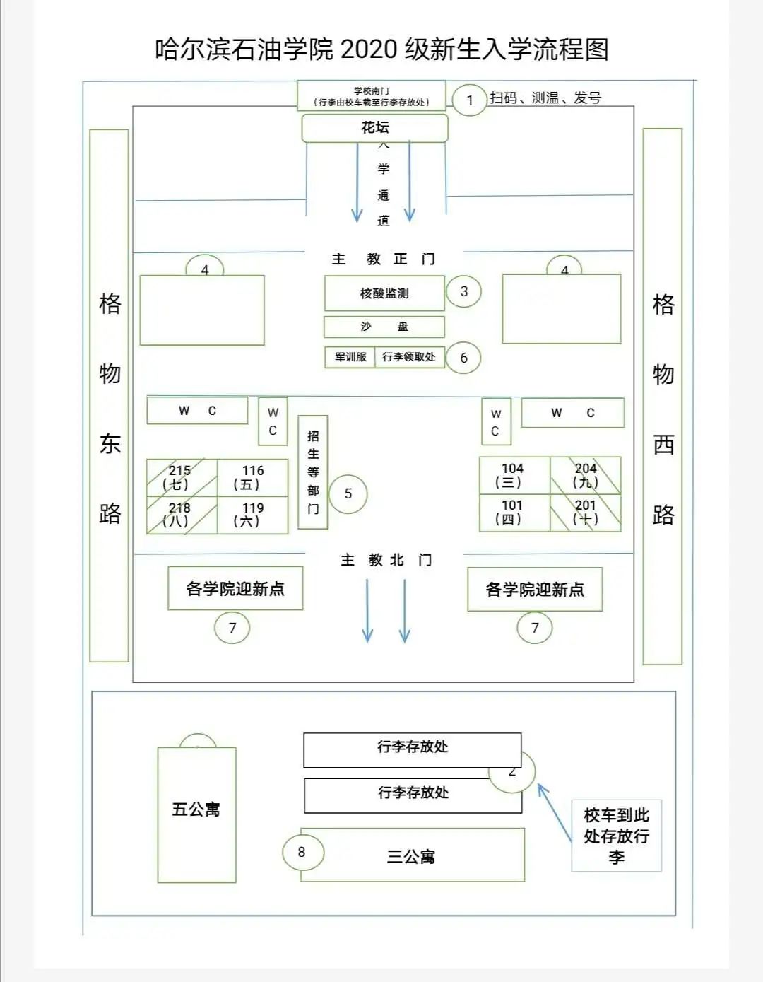 进行扫码,测体温(行李会直接运送到三公寓楼下)