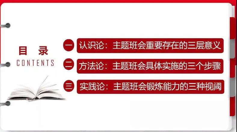 胡海霞所做的《主题班会育人功能的案例实践与思考》的有关问题中,让我们通过主题班会的实践,提升辅导员职业能力的三个方面,对主题班会的重要意义、实施步骤有了更深刻的体会,也从胡老师对认识论、方法论、实践论三个角度的阐述,加以梳理和总结。通过学习使我们明确了主题班会的意义和方法及如何达到预期效果,实现思想政治教育的目标,为今后石油工程学院开展主题班会指明了方向。积极培养当代大学生自我教育、自我管理、自我服务的意识,通过组织丰富多彩的主题班会,来引导和教育学生,培养和展观学生自我管理的能力,培养和增强学生的认识。把开展主题班会作为处理、解决班级问题,开展各项活动的有效途径。