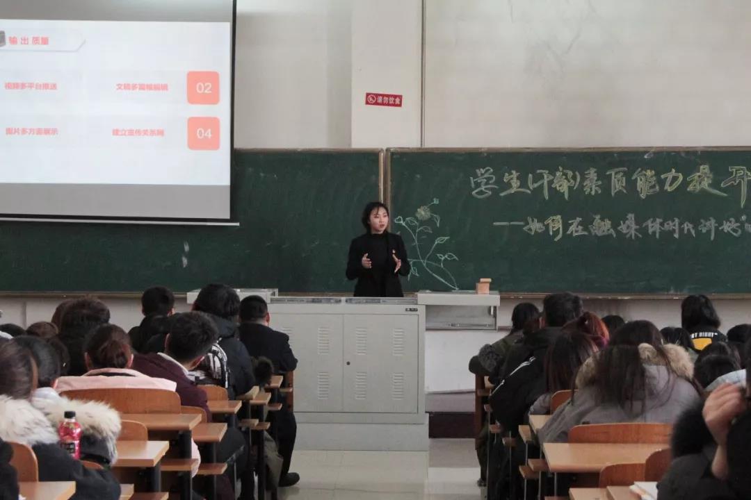 杨雪首先介绍了此次培训的意义,深刻剖析了石油工程学院在宣传媒体工作过程中遇到的各类问题。她强调:新闻稿“如何让题目抓人眼球”“活动题目如何新颖”至关重要。新闻的时效性,真实性,准确性更是重中之重。杨雪对学院在各类自媒体平台上的宣传方式也提出了要求,希望学生(干部)能够不断学习不断进步。