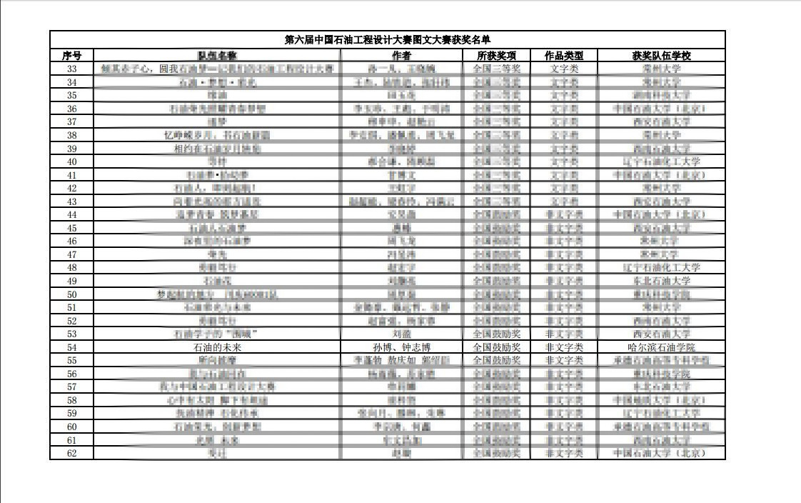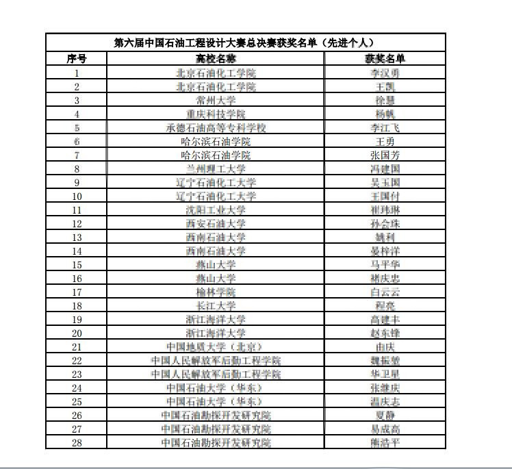 在获奖名单中,我院教师王勇、张国芳荣获第六届中国石油工程设计大赛先进个人荣誉称号。学生孙博、钟志博拍摄的作品《石油的未来》荣获图文大赛全国鼓励奖。