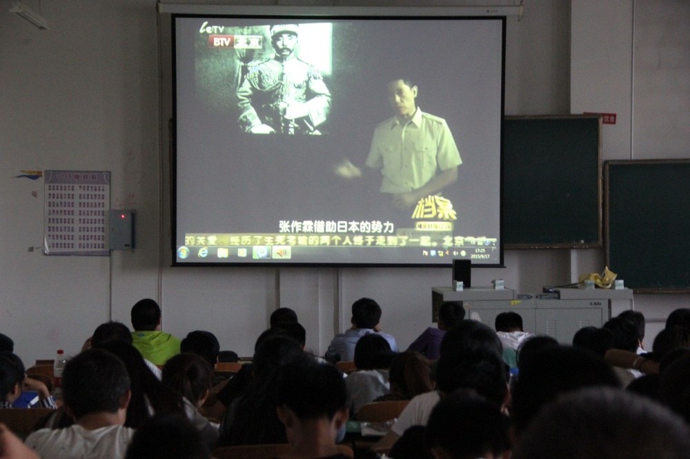 系团总支书记康平军和军事理论课教师宋旭分别组织学生们观看了视频。并且利用军事理论课,为同学们讲解了自1931年至1945年,这14年间发生的一些重大的历史事件,要求同学们要勿忘国耻,珍惜今天幸福生活。