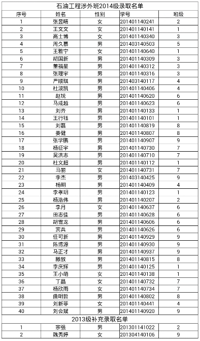 经过报名及面试选拔,在石油工程系2014级377名学生中,选出张昱晴等40人组成2014级涉外教学班,2013级补选宗强等2人,具体名单附后,特此公示。