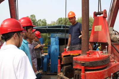 同学们在一级钻井平台上参观起下钻井杆柱