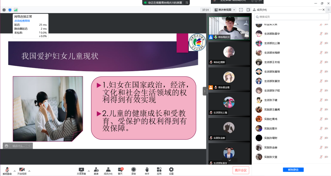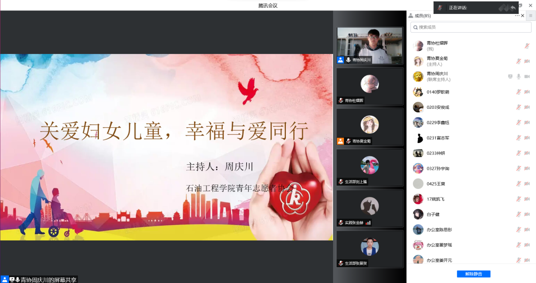 为弘扬爱护妇女儿童精神,促进社会和谐发展、身心全面发展,培养同学们爱护妇女儿童能力,提高爱护妇女儿童思想。5月8日,伟德bv国际体育石油工程学院于腾讯会议线上开展以 “关爱妇女儿童,幸福与爱同行”为主题的观影活动,党总支副书记&团总支书记张雪出席此次活动,活动参与人员共计131人。
