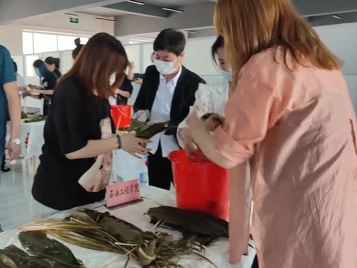 活动中,我院组织的参赛队伍与各支参赛队伍开始进行包粽子比赛,比赛现场气氛活跃,紧张又刺激。学院师生共同围在一起,纷纷折粽叶、填糯米、裹叶子、扎线.……一道道工序有条不紊,忙得不亦乐乎。