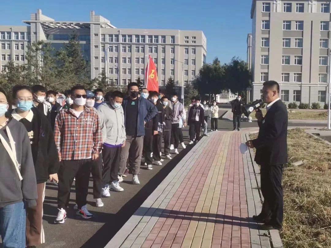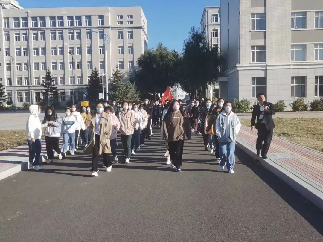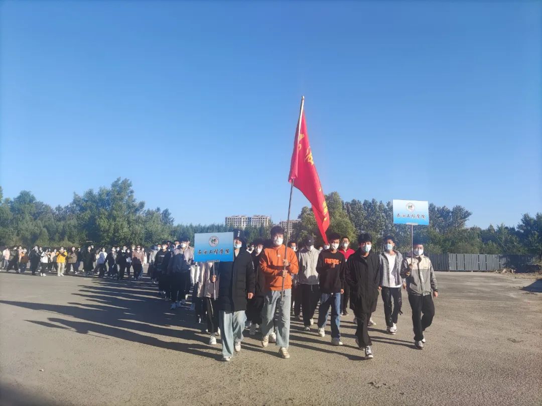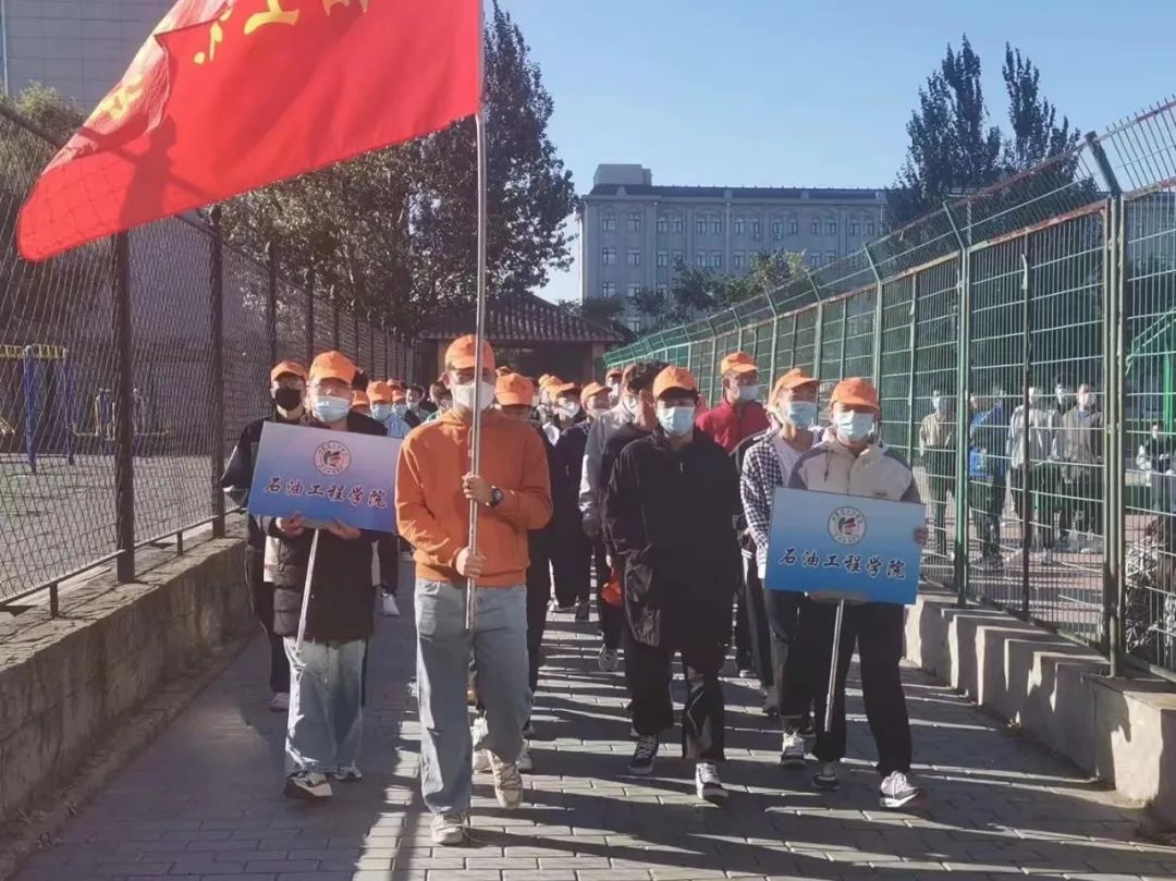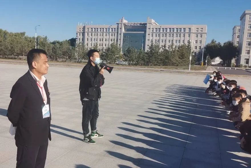 2022级的新生们在刘书记和尹航老师的带领下,沿着提前精心设计好的路线,穿梭于校园的各个地标之中。同学们先后参观了图书馆、体育馆、铁人纪念馆、食堂、篮球场、足球场、操场等校园场所。参观过程中,书记和导员也为同学们详细地介绍了这些场所的具体功能。
