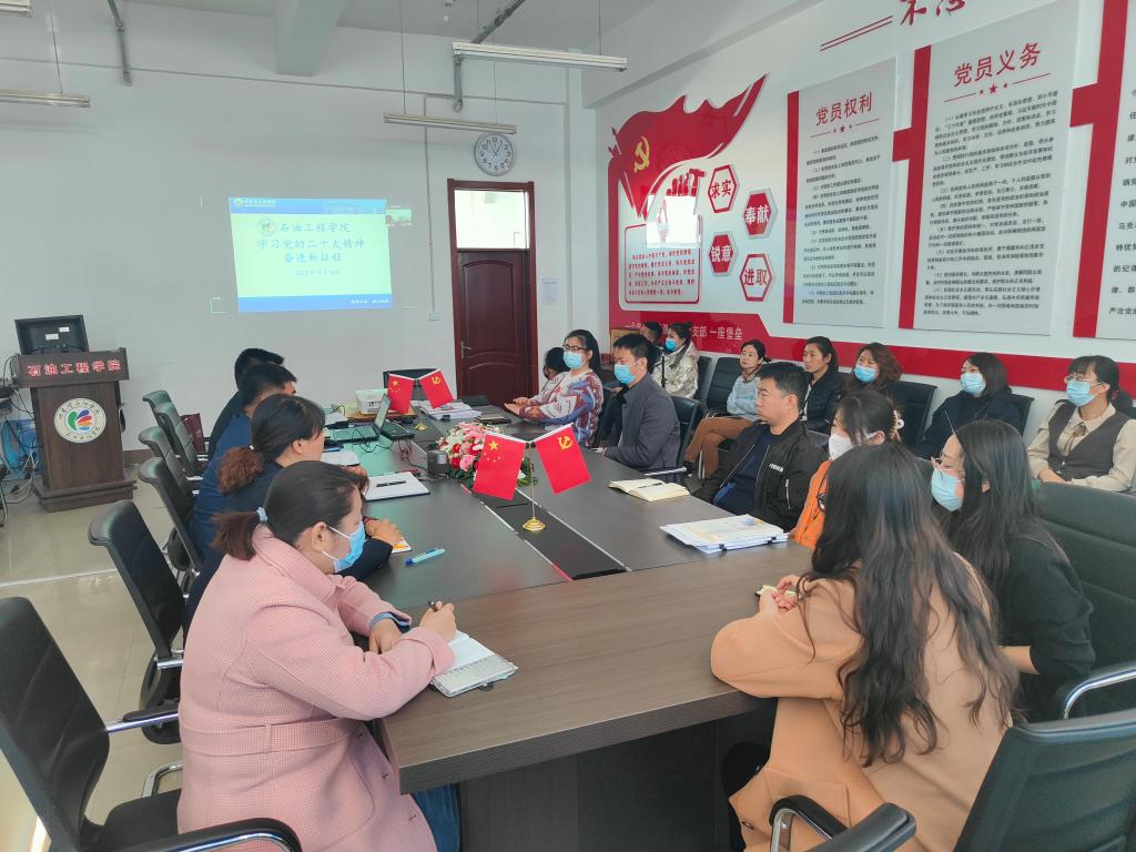 随后,院长李岳祥强调,全院干部师生要着力提高政治站位,切实把思想和行动统一到党的二十大精神上来。站在新的历史起点上,石油工程学院要始终坚持党的全面领导,坚持社会主义办学方向,坚持把发展科技第一生产力、培养人才第一资源、增强创新第一动力有效结合起来,全力提升高校科技创新能力和现代化治理水平,积极服务科教兴国战略、人才强国战略、创新驱动发展战略,在中国式的教育现代化的征程中努力贡献力量。