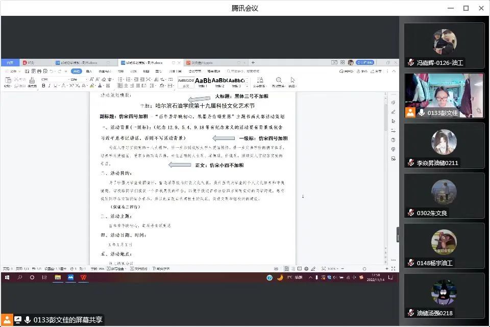 为了提高学生综合素质,紧密结合学院工作实际,认真学习、深刻领会、全面落实党的二十大精神,贯穿于学院高质量发展各方面,同时提高学生干部的全方面工作能力、工作效率和工作积极性,培养复合型人才,落实各部门的职责,做好总结和宣传工作,端正工作态度,从而更好的服务同学,11月14日,我院主席团成员彭文佳在腾讯会议开展学生干部能力提升培训。本次学生干部能力提升培训会旨在使学生干部进一步了解策划总结等活动格式,同时也对这两方面提出了不同的要求。会上详细的介绍了策划的格式要求和内容顺序,要求学生干部深化改革,具备一定的工作能力。