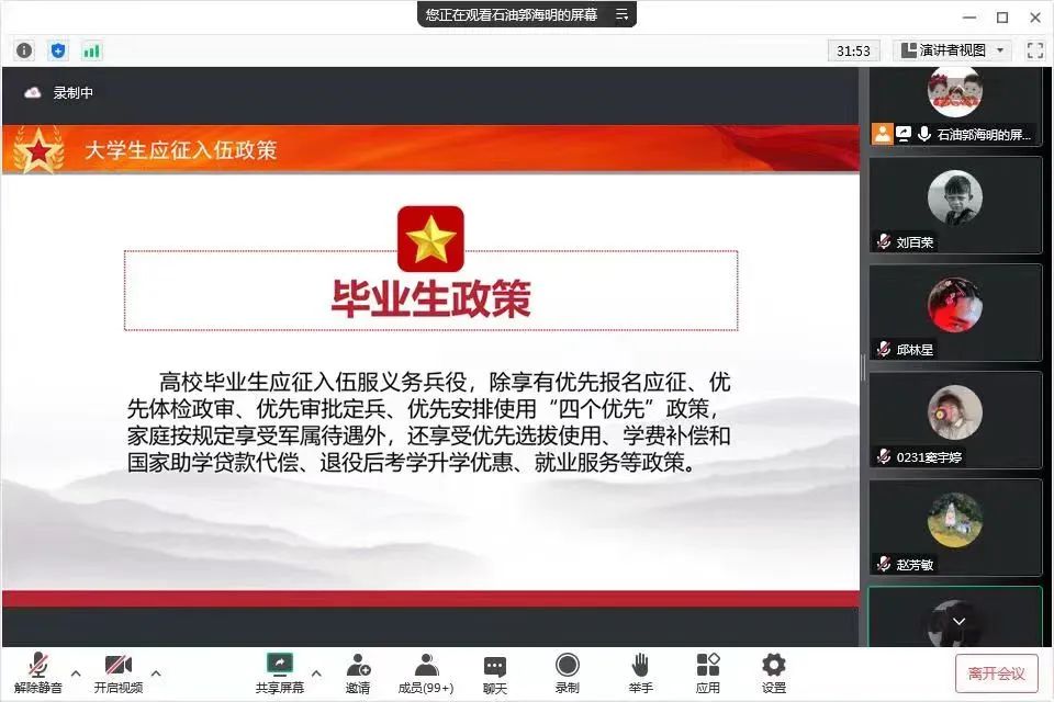 会上,郭海明辅导员强调,征召大学生参军入伍是党中央、国务院、中央军委作出的重大战略决策,对改善兵员素质、提高部队战斗力、促进青年学生的成长成才具有非常重要意义。青年大学生一定要充分认识,当兵入伍,保家卫国是我们的神圣职责,积极响应党和政府的征兵号召,把个人理想抱负融入强军梦、中国梦,踊跃报名应征,到部队中成长和锻炼自己,为国防事业贡献力量,为国为家争光接着从学生的理想抱负、入伍目的鼓励适合条件的学生参军入伍。