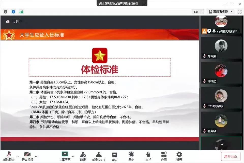随后,郭老师就同学们的问题进行解答,并分别从参军应征指南、参军优待政策、国家教育资助申请流程等方面展开宣讲,为学生详细解读国家征兵政策,介绍征兵流程、体检和政治条件及应征入伍注意事项。