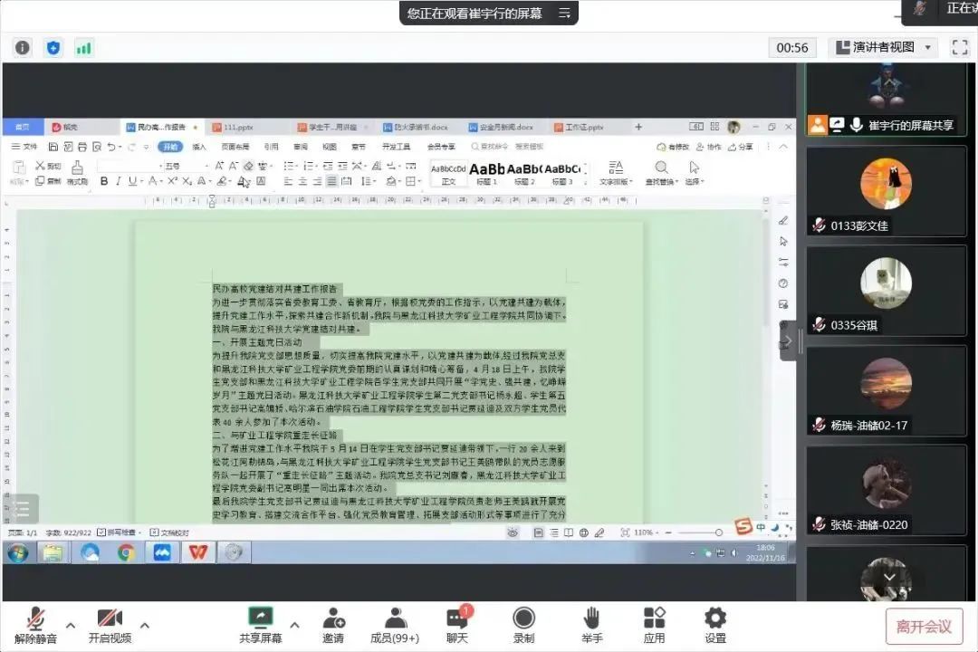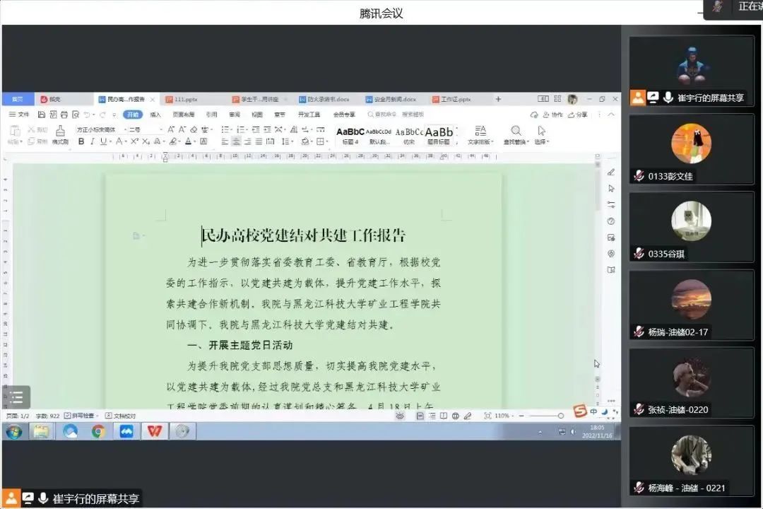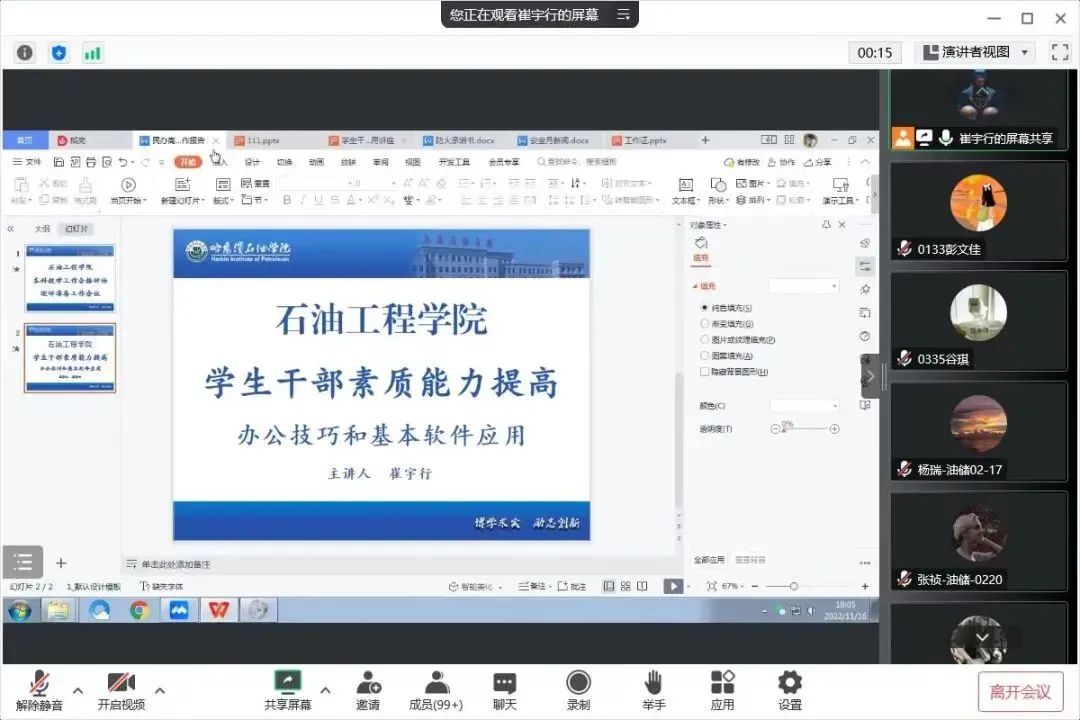 为了响应党的二十大号召,提高青年素质,提高干部质量,12月6日,我院在腾讯会议线上开展石油工程学院干部能力培训——办公软件技能培训,本次培训由学生助理(学生干部)崔宇行同学主讲,全体22级学生干部参加本次培训。