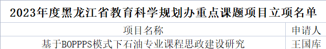近日,在黑龙江省教育科学规划领导小组办公室关于组织申报的高等教育 2023 年度省教育科学规划重点课题工作中,我院王国库老师主持的《基于BOPPPS模式下石油专业课程思政建设研究》课题获批2023年度规划办重点项目立项。