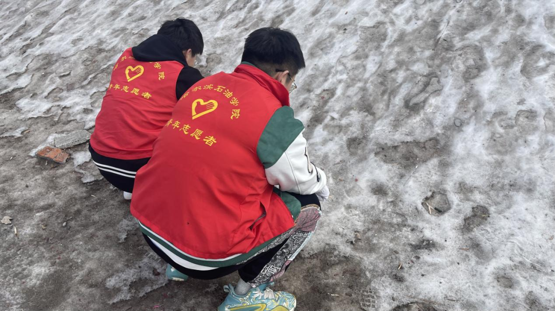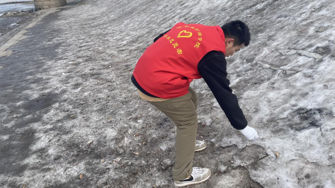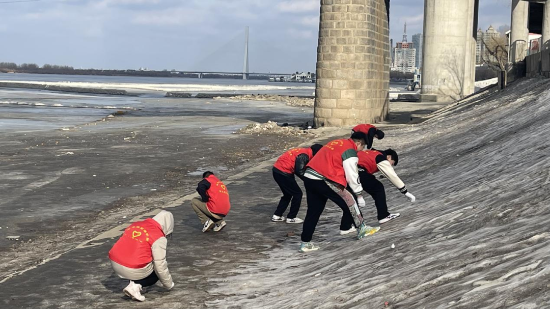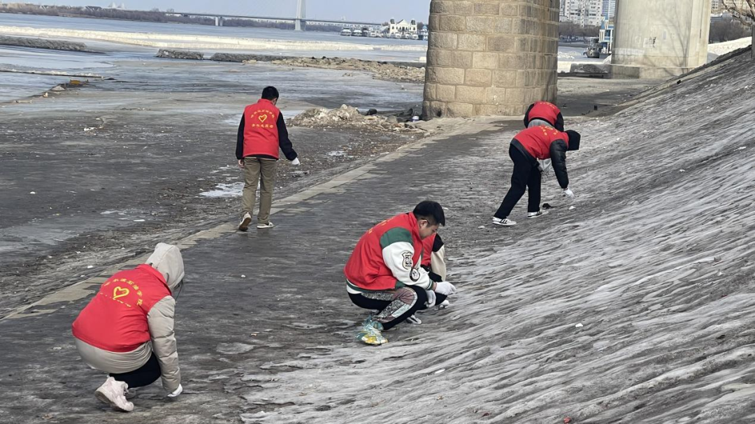 活动伊始,志愿者们提前掌握了松花江的现状并在学院领导的带领下出发松花江,活动进行时,志愿者们积极劳动,身穿红色马甲,手持夹钳、垃圾袋等工具,沿着江边有序开展垃圾清理工作,并对江边垃圾进行逐段式排查、“地毯式”清理,在重复弯腰、起身的动作中将废弃塑料袋、烟蒂、枯树枝、废纸、玻璃渣等各类垃圾“收入囊中”,以实际行动践行志愿服务精神。经过大家一下午的努力,最后将松花江附近的垃圾与江岸周边的余雪清理干净,使江边面貌焕然一新。