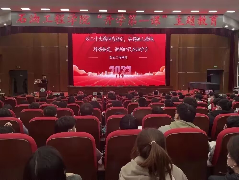 为深入贯彻习近平新时代中国特色社会主义思想和党的二十大精神,进一步加强大学生思想政治教育,引导大学生启航新学期,奋进新征程。3月9日晚,石油工程学院在图书馆报告厅组织开展2023年春季“开学第一课”主题教育活动。石油工程学院党总支书记刘雁春以《党的二十大精神为指引,弘扬铁人精神,踔厉奋发,做新时代石油学子》为主题进行授课,石油工程学院全体学生参加本次课程。