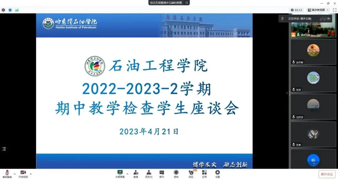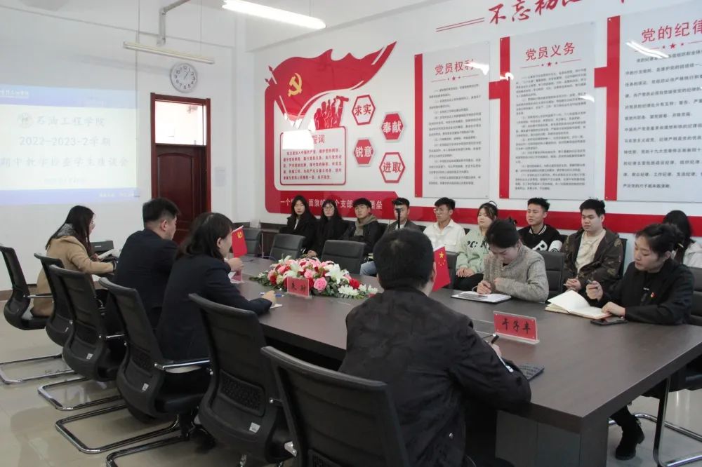 为深入贯彻党的二十大精神,遵循党的二十大纲领,同时更好了解广大学生对学院教育教学、管理服务等方面的意见和建议,充分调动学生参与管理的积极性和主动性,进一步增强我院教学管理服务工作的针对性和实效性,提高教育教学与管理服务水平。4月21日13:00,石油工程学院在主教703B组织开展期中教学检查座谈会,石油工程学院院长李岳祥、副院长朱砂、学生党支部书记王娜、总支纪检委员赵昕、油气储运系主任于子丰,及各年级学生代表参加本次活动。