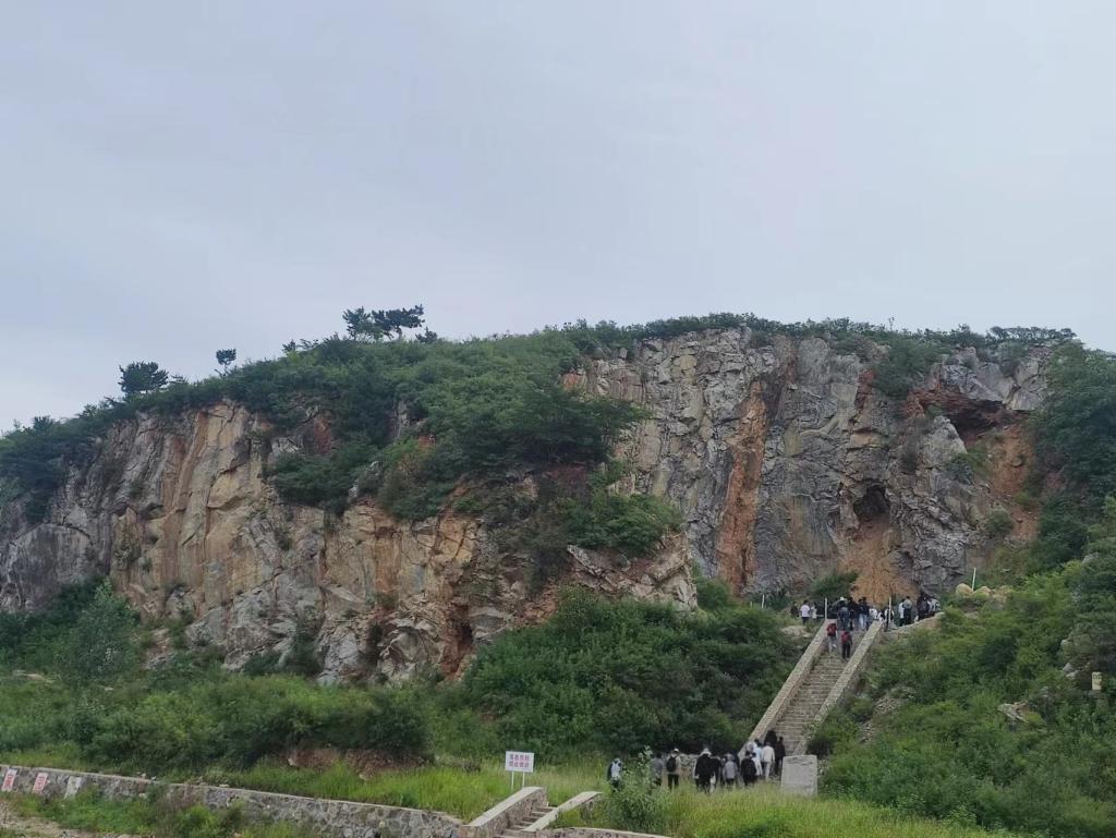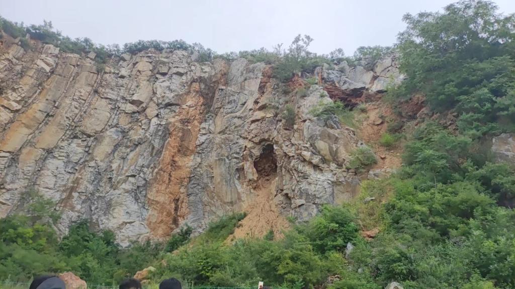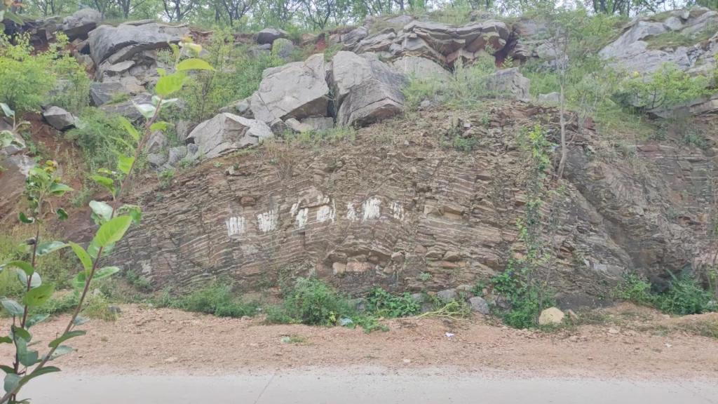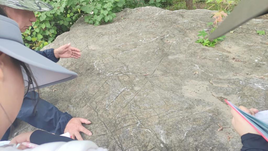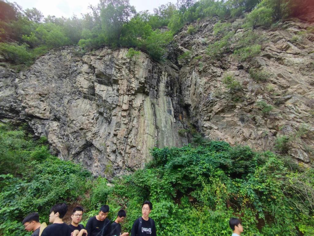 来到今天第三个地质观测点:吴庄。此观测点可见亮甲山组黄斑豹皮灰岩与张夏组鲕粒灰岩,此处二者之间存在地层缺失,判断为断层构造。继续前行可见多组保存完好的背斜与向斜,由于其形态称为“九龙壁”。