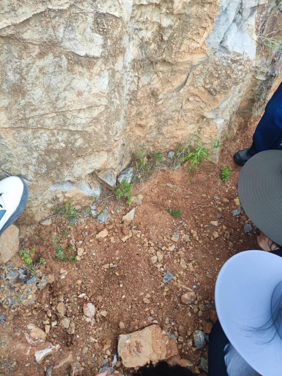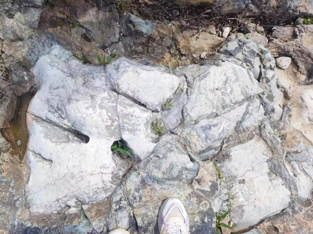 来到今天第一个地质观测点:山羊寨以东台阶上。该点为构造点,可见直立岩层,为亮甲山组黄斑豹皮灰岩,可见溶洞和洪积扇。