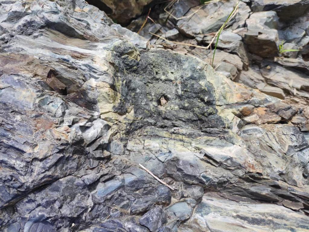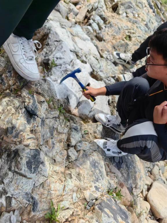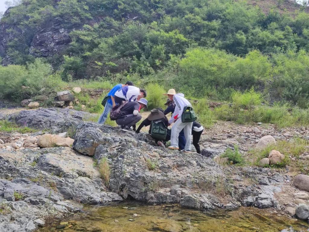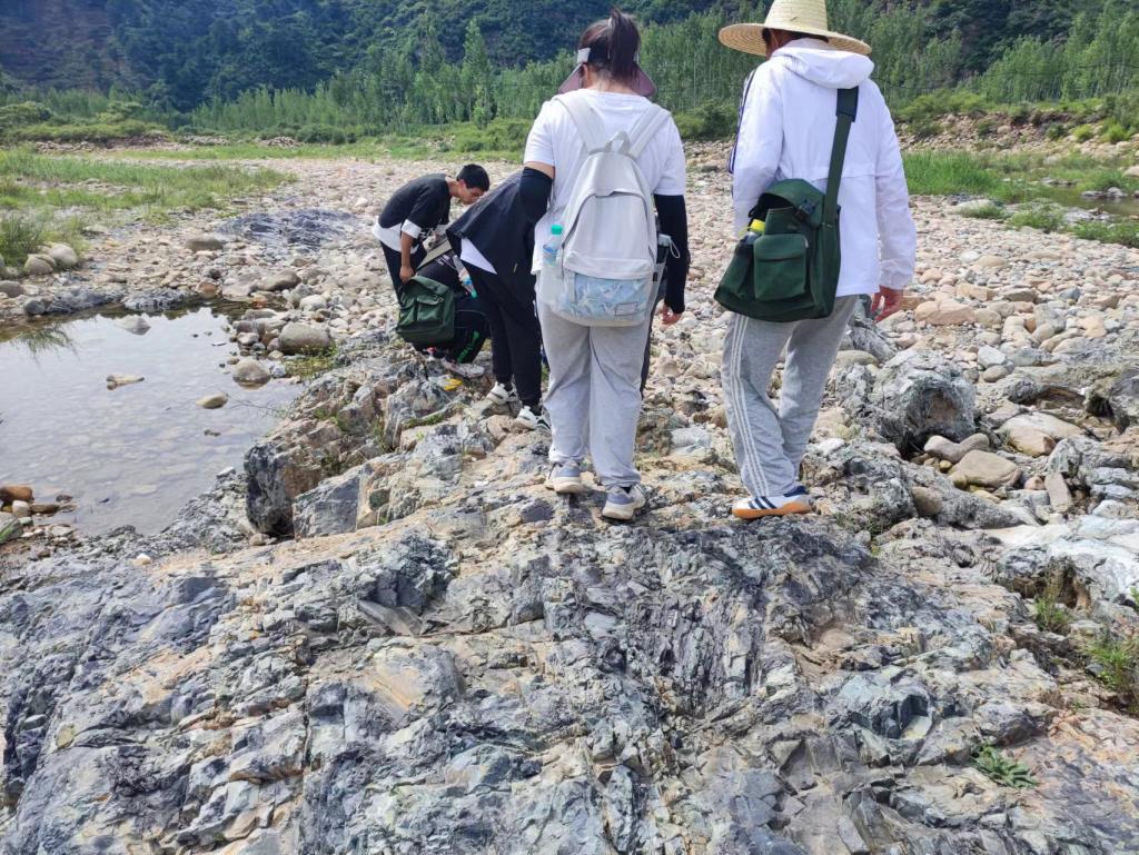 到达花场峪河后,观察到黑色变质岩,部分岩石中含有汉白玉和宝石,同学们在此处采集了岩石样本。