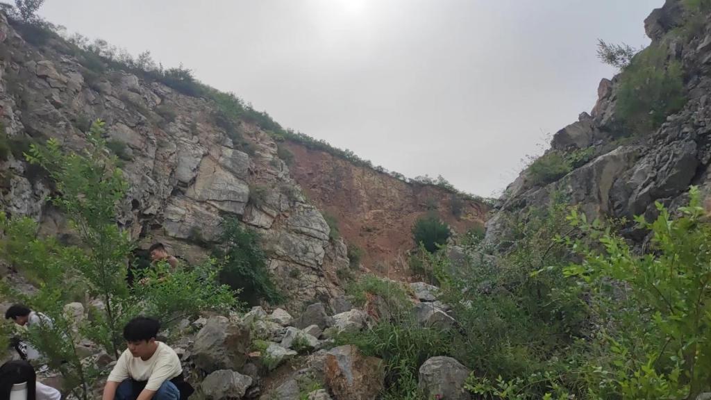 从吴庄前往大石河支流(也称为花场峪河)的途中,看到了“山崩地裂”。姜老师解释到:此处水平沉积的岩层受到构造应力后断裂,上方岩石掉落到形成的大裂缝中,称为“山崩地裂”。