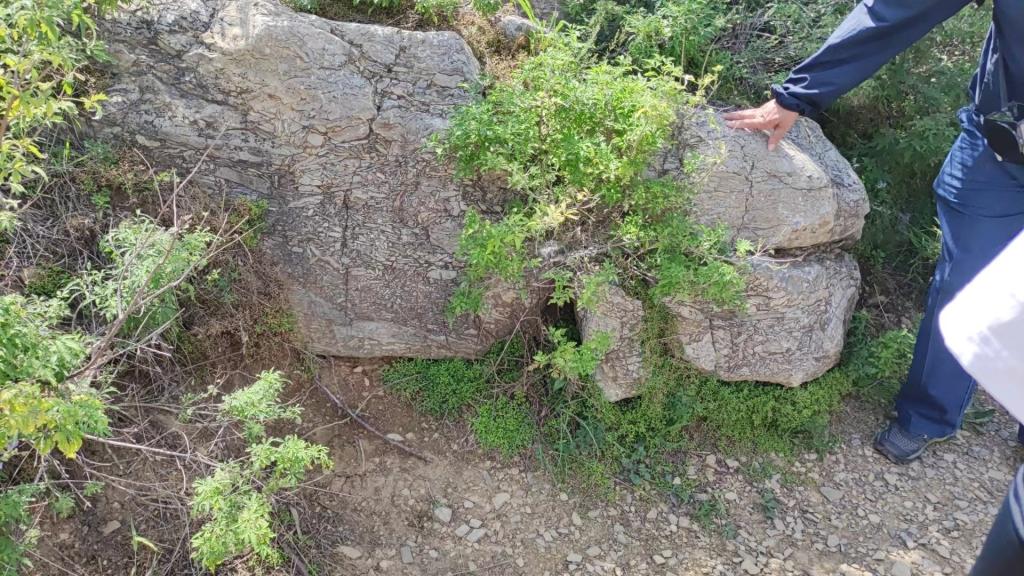来到今天第四个地质观测点:距潮水峪东山坡西100m。此处为崮山组与长山组的分界点,长山组为大竹叶状砾屑灰岩,崮山组为紫色带氧化圈的竹叶状灰岩。