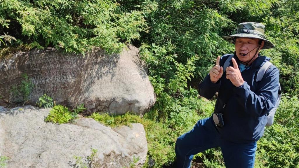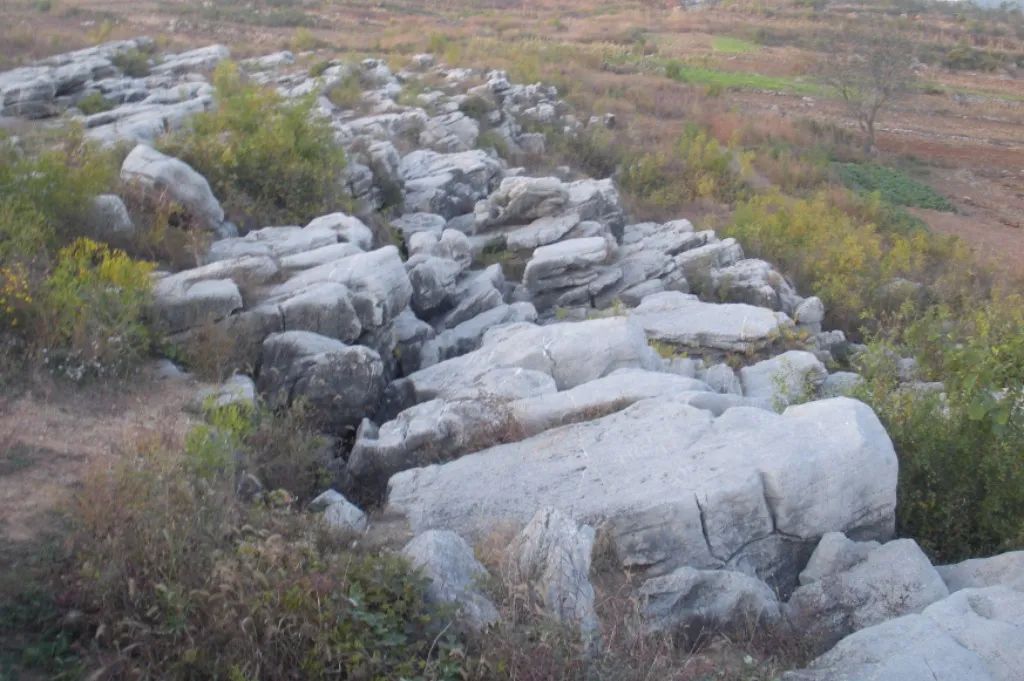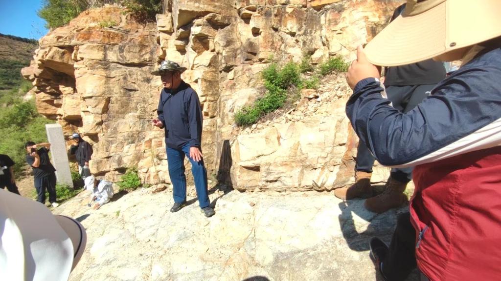 来到今天第八个地质观测点:沙锅店村东。此处为岩溶地貌观测点,可见花岗岩岩墙侵入在亮甲山地层中。上盘岩溶地貌显著,下盘岩溶地貌轻微,地下水受岩墙阻挡,因此岩溶作用强烈。