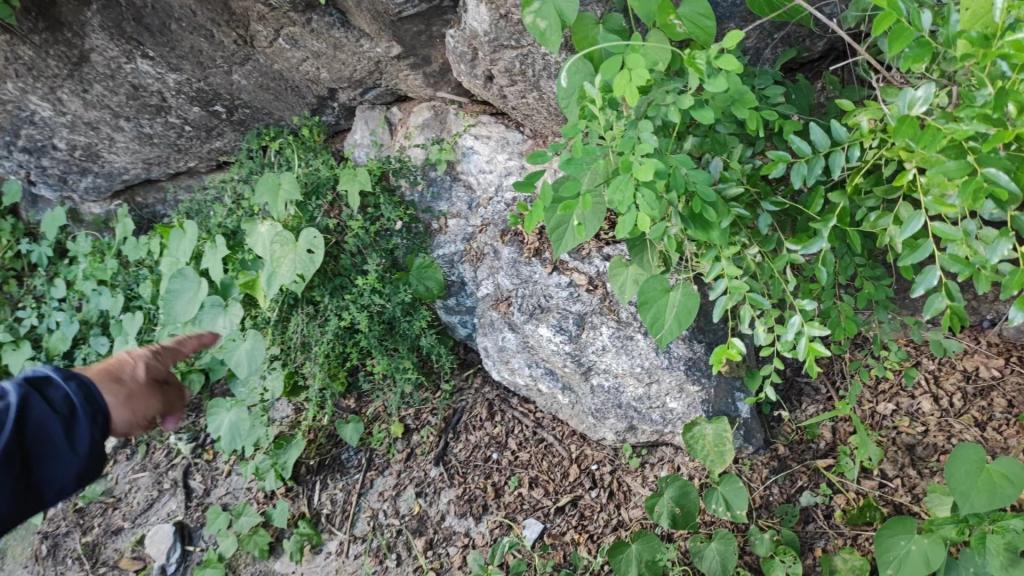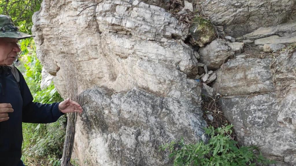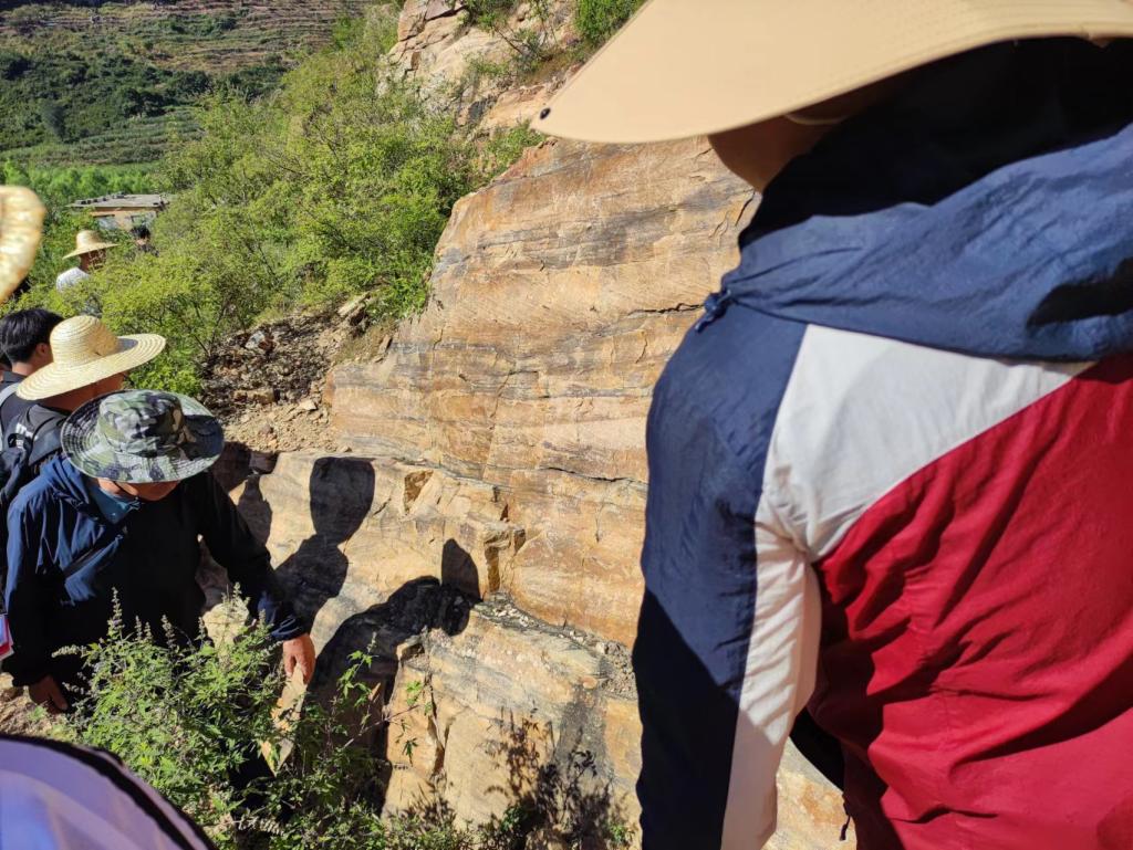 来到今天第七个地质观测点:潮水峪村北。此处为断层构造观察点,断层上盘为凤山组薄板状灰岩,下盘为冶里组厚层灰岩,断层面直立,可见垂直擦痕,断层内可观察到构造透镜体,上盘凤山组地层可见牵引褶曲,此处上盘上升,为逆断层。