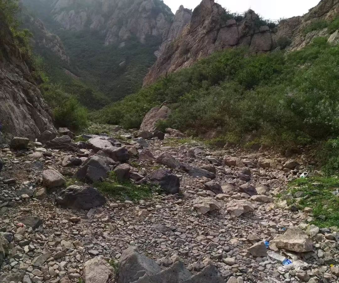 干涸的河道并不算宽,底部乱石堆叠,两侧灌木丛生,走起来需时刻小心谨慎。一路上干涸的河道随处可见砾石沉积物,老师一路带领同学们观察沉积物的岩性,河流的下蚀作用,山区河流地质作用特点。