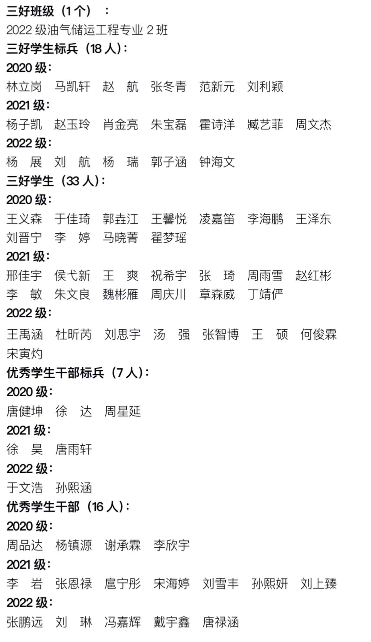 根据《伟德bv国际体育学生评优办法》、《关于评选伟德bv国际体育2022-2023学年度学生评优的通知》要求,石油工程学院2020-2022级在籍在校生共643人,根据评选比例,应评出三好班级3个,三好学生标兵19名,三好学生33名,优秀学生干部标兵9名,优秀学生干部16名。2020、2021、2022年级经筛选、评议,实际评选出三好班级1个,三好学生标兵18名,三好学生33名,优秀学生干部标兵7名,优秀学生干部16名。公示名单如下: