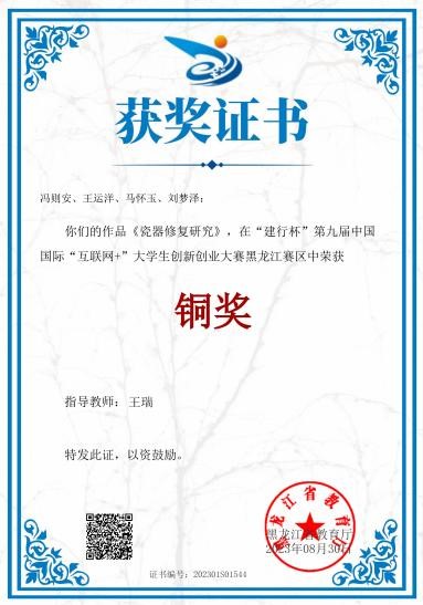 近日,在“建行杯”第九届中国国际“互联网+”大学生创新创业大赛黑龙江省赛区中,我院冯则安、王运洋、马怀玉、刘梦泽的作品《瓷器修复研究》,荣获铜奖,作品由王瑞老师指导。本次获奖不仅体现了石油学子勇于挑战、善于创新、具备强烈创业精神拼搏精神,更加彰显了我院创新创业教育的显著成效。此次获奖得益于此次大赛所提供的学生交流沟通、创新学习平台,不断激发我院学子勇于挑战,勇于创新的能力,同时不仅有力深化石油工程学院的创新理念,提升学生的创新能力,更营造出更加浓厚的创新创业氛围。“未来已来,未来我来”,未来,征途依旧漫漫,未来,脚步更大更远!让我们共同携手,共同努力,以学生为本,为学生的创新发展创造更美好的明天。