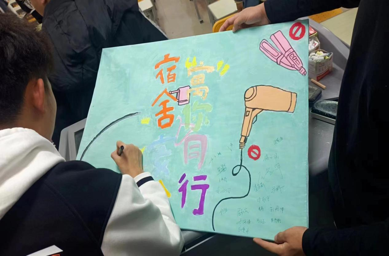 以吹风机卷发棒等违禁电器,管制刀具、棍棒等违禁物品举例。引导学生直观违规电器类型,认识安全隐患。并且通过展示各类因使用违章电器而引起火灾的图片,教育学生了解安全用电常识。引导学生学习、遵守宿舍安全规章制度。同时分享因使用违禁电器导致发生灾害的案例,充分使同学们了解到违规物品存在的危害,并认真解答了学生们针对违规电器的处理方面提出的问题,使同学们更加了解规范使用电器和安全用电的重要性。
