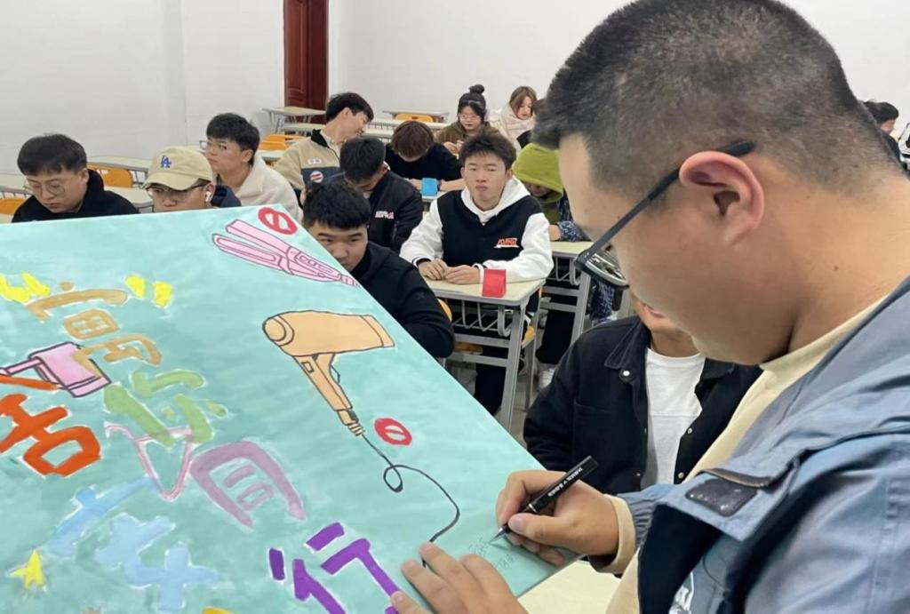 为规范 大学生之 间文明的礼貌用语及营造和谐安全的学习生活环境,教育引导学生充分认识到使用违章电器的危害性,增强“祸在一瞬,防在平时,防患于未然”的安全防范意识,切实做到警钟长鸣,共同构建平安、健康、文明、和谐的宿舍环境,10月22日我院利用晚自习宣传文明礼貌用语和禁止使用违规电器。