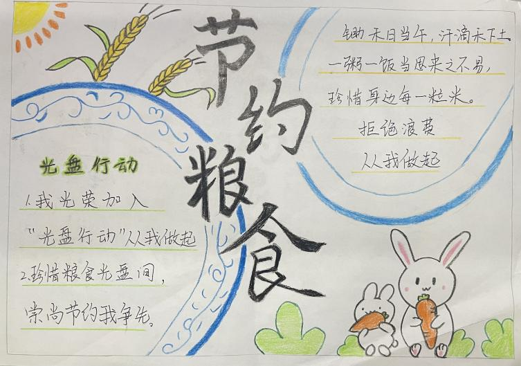 活动中,志愿者呼吁同学们无论在家还是在外吃饭,要做到吃多少点多少,并组织同学们进行“光盘行动”。将“节约粮食”的理念传递给更多的人,以志愿者精神引领光盘意识,以关键少数带动相对多数,树立“节约光荣,浪费可耻”的思想观念,积极做“光盘行动”的传播者。同时志愿者们向同学们征集有关手抄报的绘制想法及选定人手后,精心绘制节粮手抄报,同学们通过光盘行动的传播和绘制的手抄报更加懂得了节约粮食的重要性。活动取得了非常好的反响。