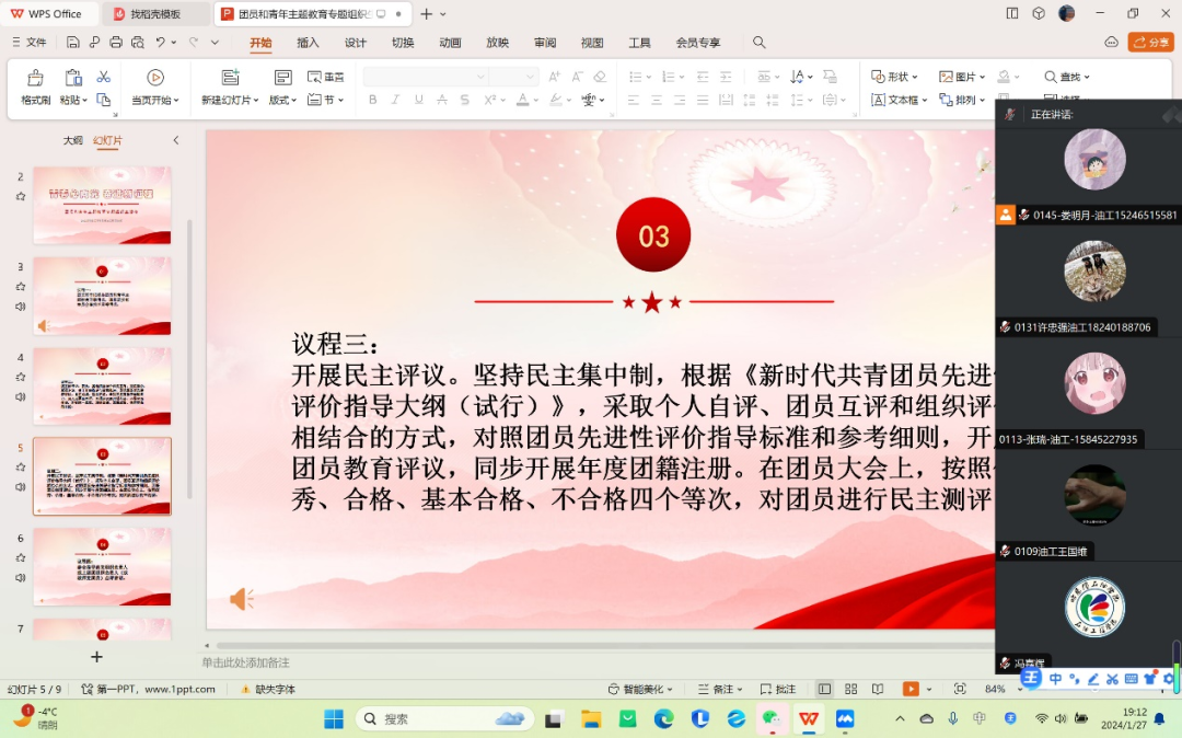 此次会议在1月27日,1月28日19:00陆续开展,1月27日各年级团支部开展主题教育专题组织生活会同时进行团员教育评定。