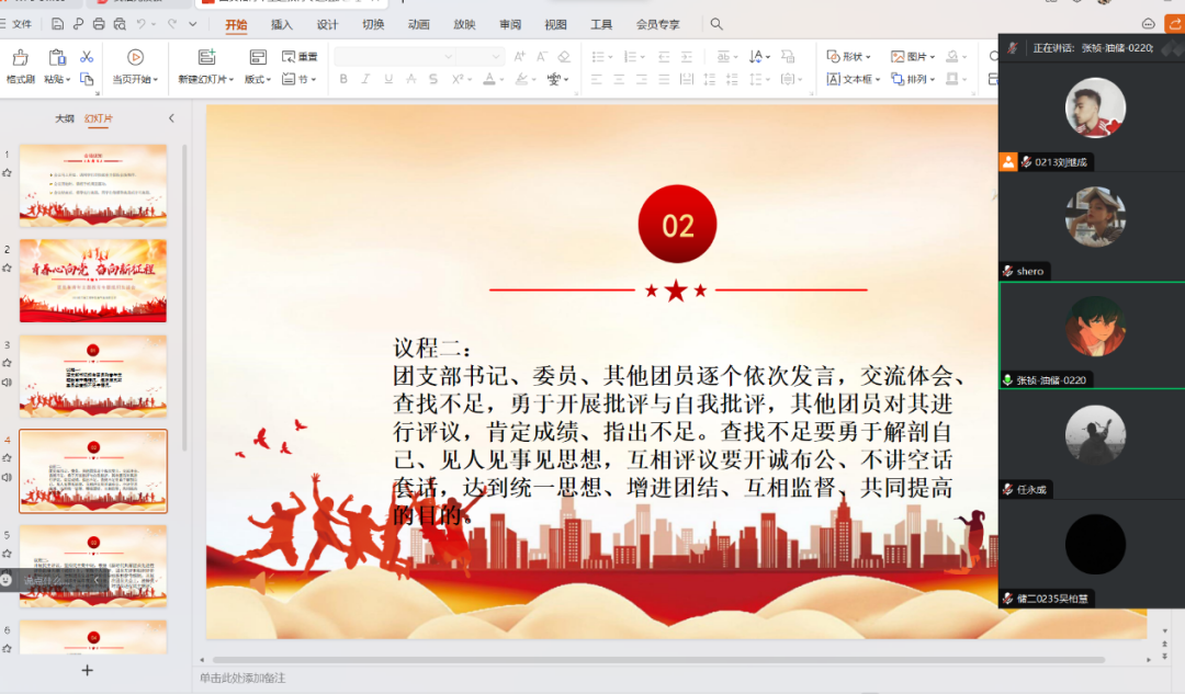会议第二项由团支部书记、委员、其他团员逐个依次发言,交流体会、查找不足,勇于开展批评与自我批评,其他团员对其进行评议,肯定成绩、指出不足。