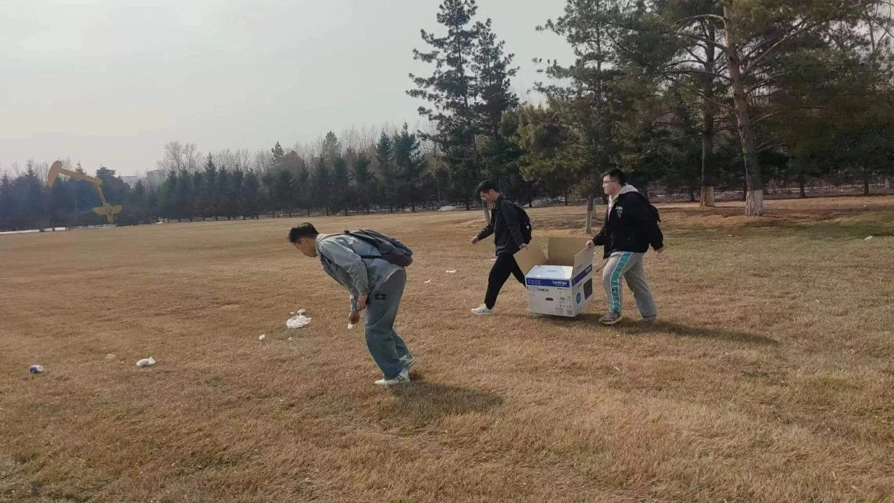 3月27日中午,2022级油气储运工程2班任永成、杨瑞、汤强,将大风刮入草地中的纸箱、空瓶、塑料袋等一一拾起。