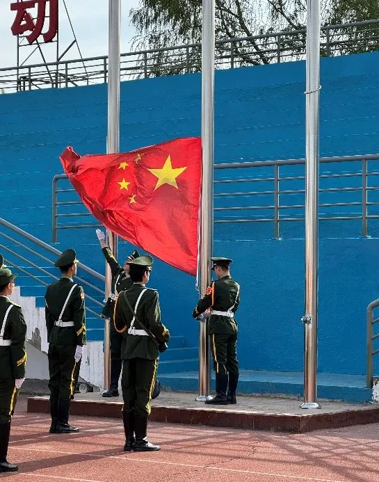 清晨的第一缕阳光洒满校园,师生们整齐列队,国旗班迈着铿锵步伐,护送五星红旗走向升旗台。在庄严的国歌声中,五星红旗冉冉升起,迎风飘扬,象征着全校师生对祖国的热爱和对美好未来的憧憬。