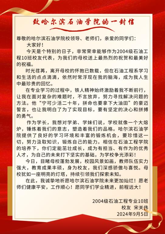 随后,校友代表宋关伟在发言中表达了对母校的感恩之情。他表示,母校是他们梦想起航的地方,在这里他们收获了知识、友谊和成长。如今,希望通过自己的绵薄之力,为母校的发展贡献一份力量。