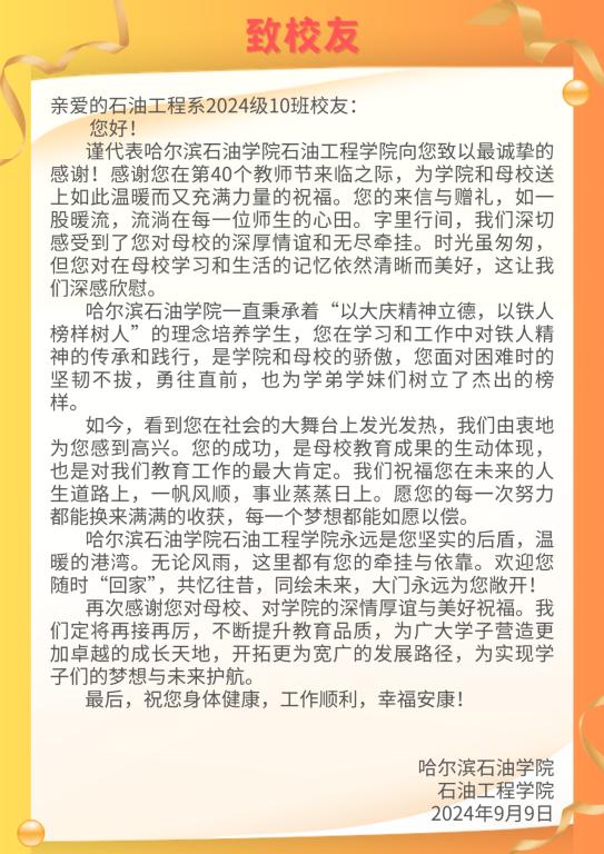 9月10日,正值第40个教师节这个特殊的日子,我院2004级石油工程专业10班校友向母校表示节日慰问,并向学校及学院来信祝福、献礼木雕摆件。