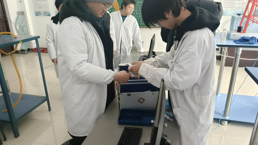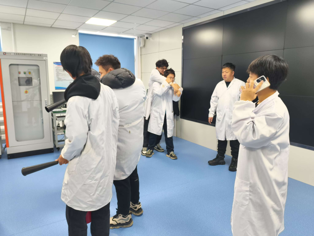 机械伤害演习是针对实验室常见的机械设备操作不慎造成的人身伤害。在这一环节中,一名“受伤”的学生被迅速发现并进行了急救处理,包括止血、包扎以及紧急转移至安全地带。演习不仅考验了学生们的急救技能,也让他们意识到了在操作机械设备时安全防护的重要性。