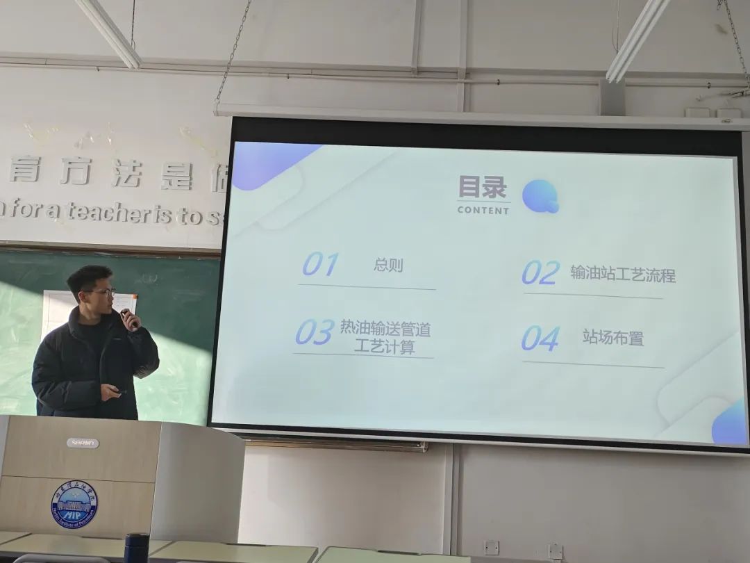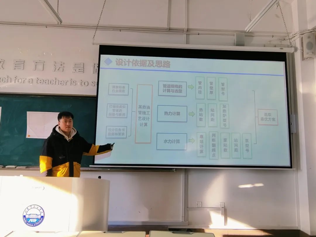 活动伊始,张嘉琦老师指出本次课程设计以热油管线工程项目为背景,充分结合专业特点,培养大家的团队协作,考察大家对专业知识的运用能力。并向大家讲解了答辩流程、答辩要求等相关事项。各个小组抽签决定答辩顺序后,课程设计答辩正式开始。