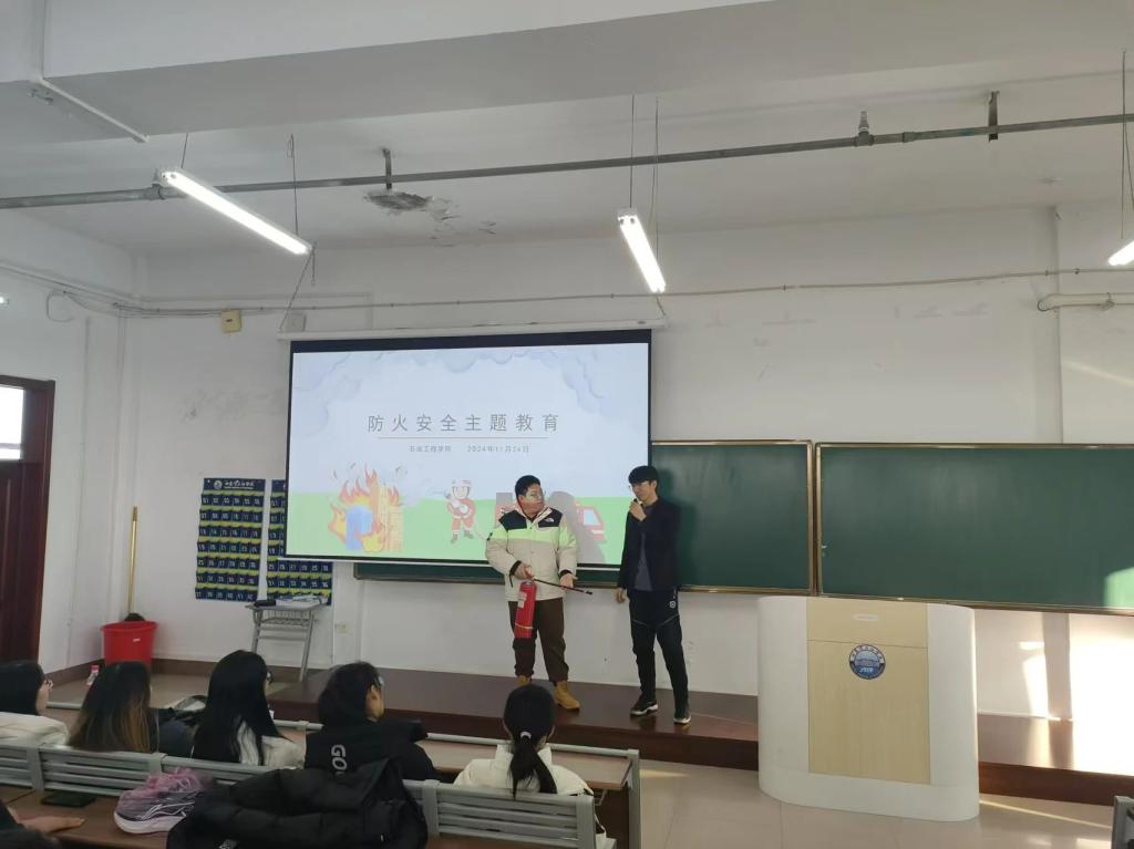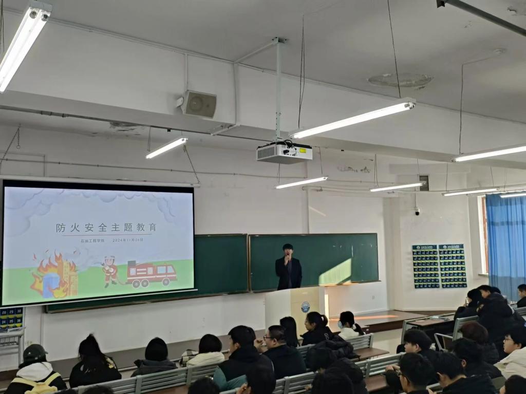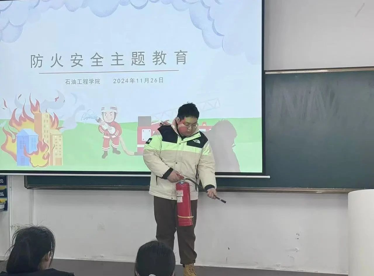 活动伊始,24级新生辅导员王琦源老师发表开场讲话,强调了防火安全在校园及石油工程领域的重要性。随后,老师通过精心制作的幻灯片和生动的视频案例,详细讲解了火灾的成因、预防措施以及报警与逃生的正确方法,使师生们对火灾危害有了更为直观深刻的认识。
